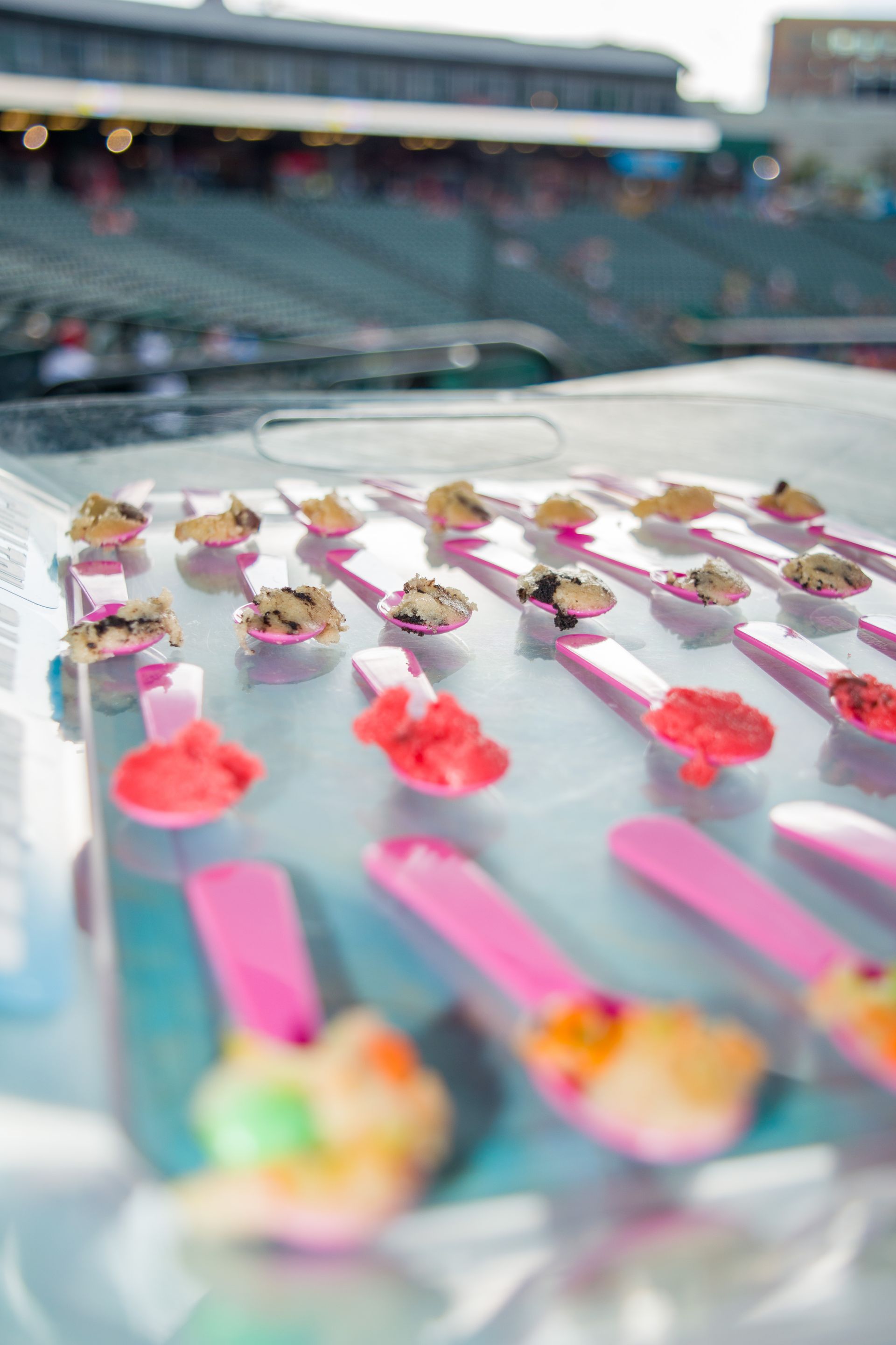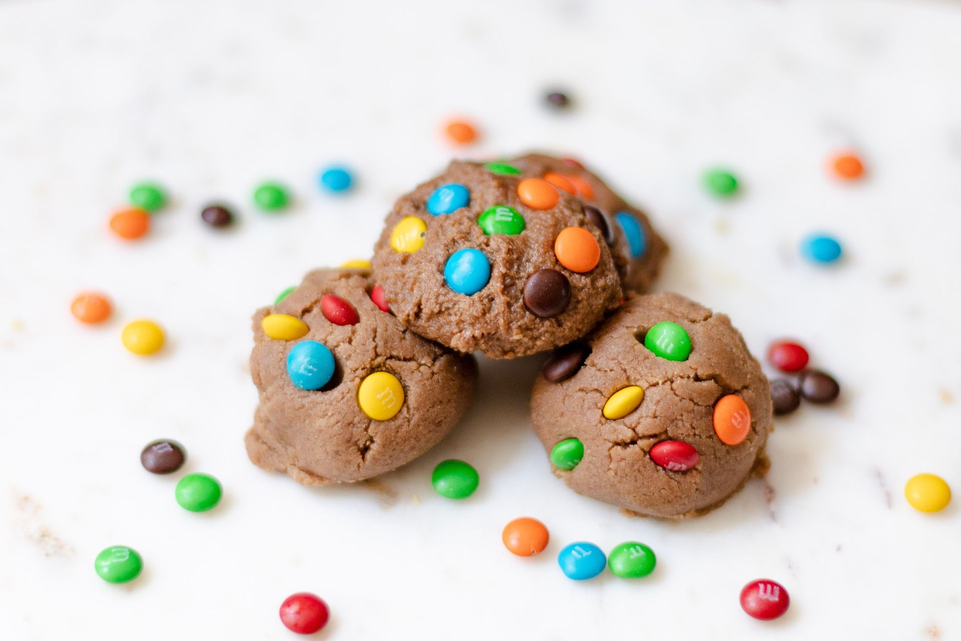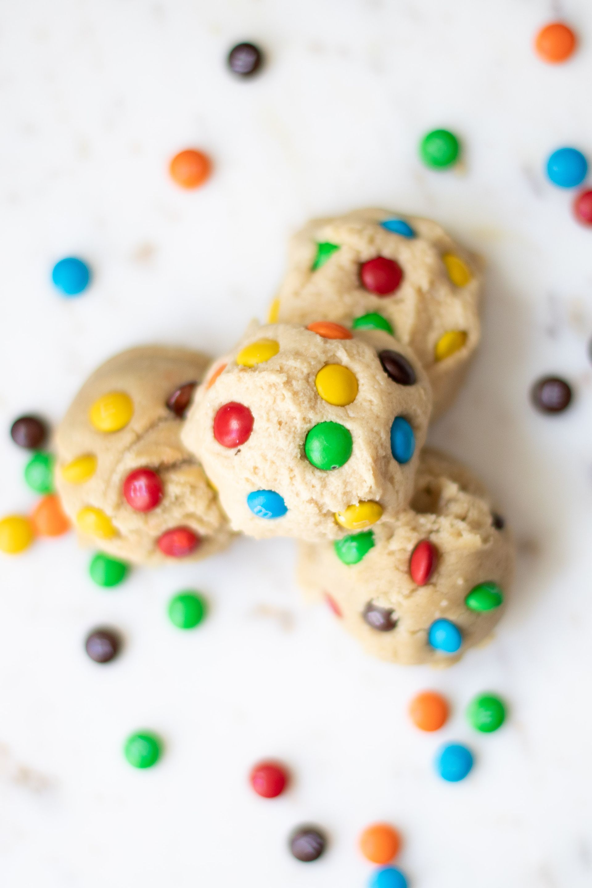 Vanilla base dough with M&Ms mixed in. Sold as dough ball or 8 oz cup.